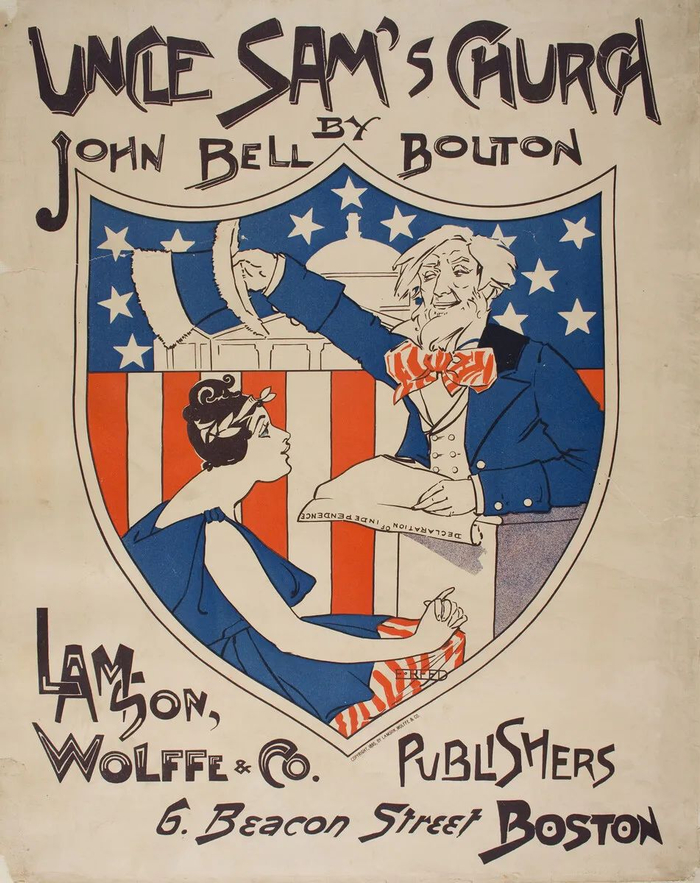 埃塞尔为 John Bell Bouton 的《山姆大叔的教堂:他的信条、圣经和赞美诗书》绘制的海报/ 1895 年