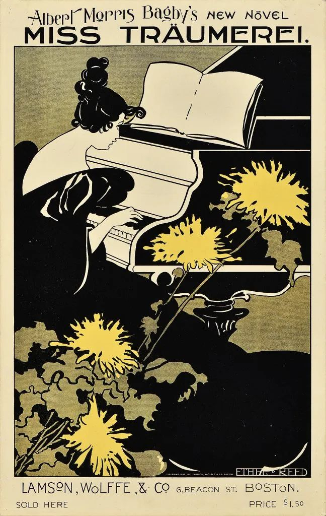 埃塞尔为音乐家兼作家阿尔伯特·莫里斯·巴格比的第一部小说《特劳梅雷小姐》创作的海报,用色淡雅,前景的菊花可以看出日本艺术的影响。/1895 年