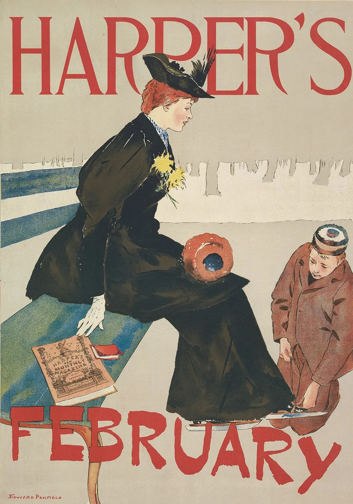 海报这种图像生动、色彩鲜明的印刷品,连同从欧洲流行而来的多种艺术风格,为美国生活带来了无限的新鲜感和想象力。/图为爱德华·彭菲尔德设计为《哈珀月刊》(Harper's Monthly Magazine)1894 年 2 月号设计的海报