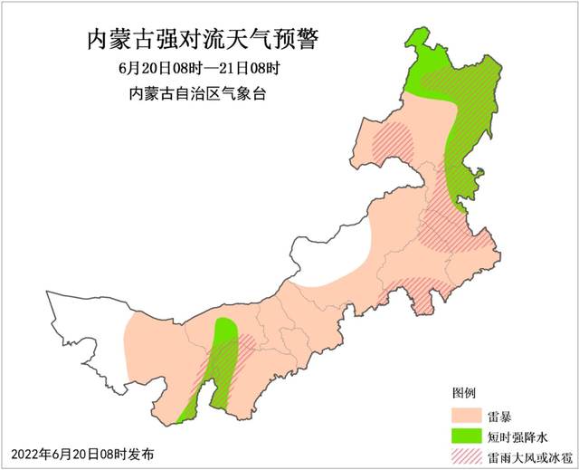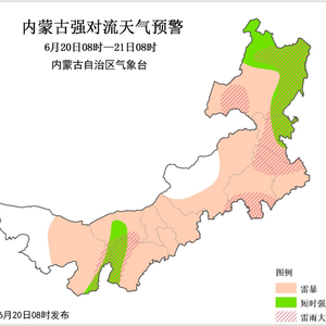 内蒙古气象台6月20日8时发布强对流蓝色预警:预计6月20日8时至21日8时,全区大部有雷电天气,其中,阿拉善盟东部、乌海市、巴彦淖尔市中部、鄂尔多斯市西部、兴安盟东北部、呼伦贝尔市北部和东部地区可能有短时强降水,小时雨量15~30毫米,阿拉善盟东南部、乌海市、巴彦淖尔市南部、鄂尔多斯市西部、锡林郭勒盟南部、赤峰市南部和东北部、通辽市北部、兴安盟大部、呼伦贝尔市东部和西南部有雷暴大风,并可能伴有冰雹,局地有可能出现龙卷等强对流天气。