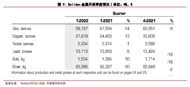 Boliden2022年一季度开采锌矿58127吨,环比下降14%,同比减少8%。主要原因是Garpenberg和Tara的精矿产量有所下降。前者受到对矿道和矿井提升机的维护的影响,而后者因为去年11月大量水流入矿中,影响生产,预计将持续影响到二季度的生产。