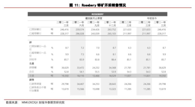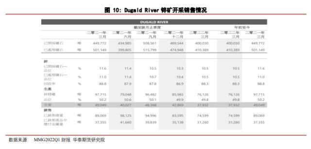 2022年一季度Dugald River及Rosebery锌矿总产量为49,736吨,较去年同期减少27%,主要由于新冠疫情导致可用劳动力减少以及因开采顺序导致的矿石品位的下降,2022全年锌产量指导维持225,000吨至255,000吨之间。