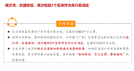 其中的一个关键点:南沙湾、庆盛枢纽、南沙枢纽3个区块作为先行启动区,依托交通枢纽快捷通达香港的优势,加快形成连片开发态势和集聚发展效应,有力带动南沙全域发展,逐步构建“枢纽带动、多点支撑、整体协同”的发展态势。