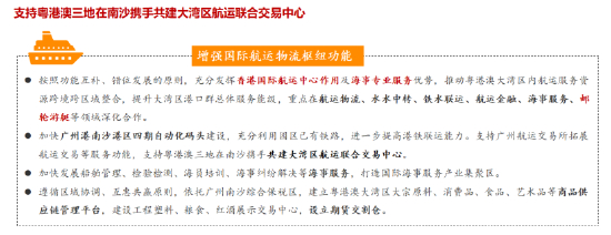 根据《南沙方案》规划,支持粤港澳三地在南沙携手共建大湾区航运联合交易中心,增强国际航运物流枢纽功能。