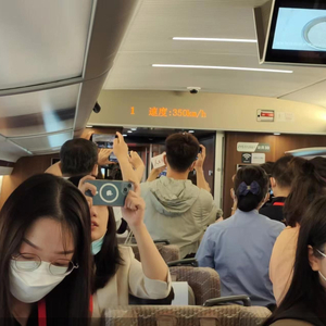 早上7点20分左右,距离G51出发不过25分钟,车窗外的景色早已从繁华的城市变成了广袤的田地,此时列车时速表也正式达到了350km/h。有人将盛着水的透明水杯放在窗边,水面几乎没有明显的波动。