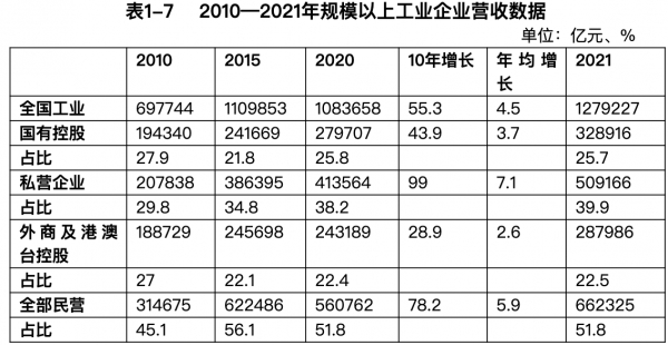 数据显示,2010年至2020年,前五年全国工业企业营业收入总额(绝对数额)增长了近55%,后五年反而还有减少。其中前五年国有工业营业收入总额增长了24%,后五年只增长了16%。2021年,国有企业营业收入大幅度增长,增长了21.2%。