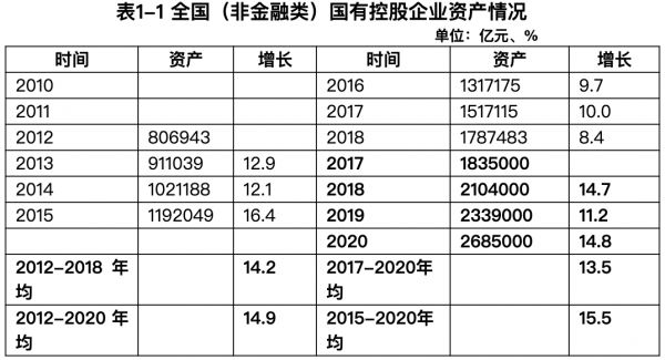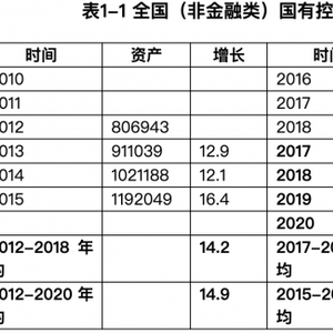数据来源:1、2012年以来历年财政部关于国有控股企业经济运行报告和2018年以来历年国务院向全国人大提出的关于全国国有企业资产管理情况报告。两份报告2017年与2018年数据不同,此表均列出;2019年后财政部没有公布国有企业资产总额情况。黑体绝对数为国务院数。2、增长率为自己按绝对数计算。