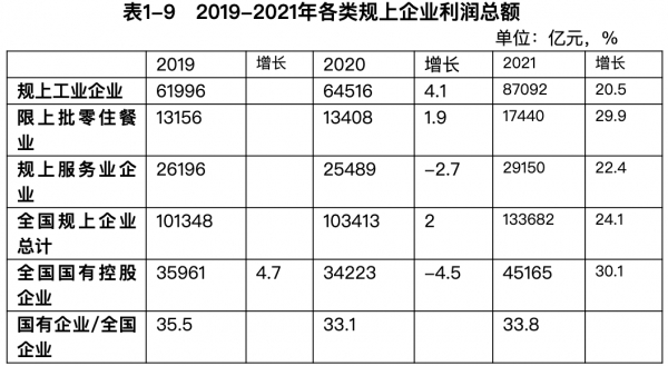 2019、2020和2021年,全国国有控股企业的利润为35961亿元、34223亿元和45165亿元,同期,全国规模(限额)以上企业的利润为101348亿元、103413亿元和133682亿元,国有企业利润相当于全国规模以上企业利润的35.5%、33%和33.8%。