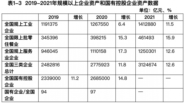 全国规上企业资产与全国国有控股企业资产:根据国家统计局数据,2019年和2020年,全国规模以上(限上)企业资产总额为248.28万亿元和277.6万亿元。根据国务院向全国人大报告数据,全国国有企业资产总额为233.9万亿元和268.5万亿元。国有控股企业经营性资产相当于全国企业经营性资产的94%和97%。