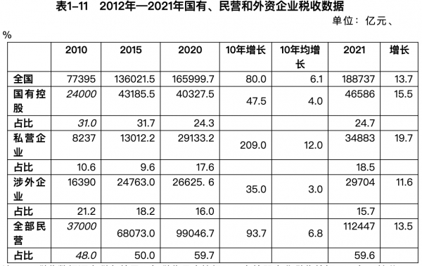 注:1、税收数据源自税务总局历年税收月度快报,国有控股企业税收总额2012年开始公布;2、2010年国有控股与全部民营企业税收总额及占比为推算估计数(斜体字);3、私营企业而非全部私营控股企业;4、民营企业是指除国有控股和涉外企业之外的其他所有企业。
