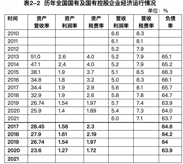 全国情况:全国国有及国有控股企业的资产利润率,2013年为2.6%,之后一路下降,2015年为1.9%,到2020年为1.27%,十年下降了一半(见表2-2)。这就是说,国有企业的每百元资产创造的利润,2013年为2.6元,2020年为1.27元,远低于银行一年期以上的贷款利率。