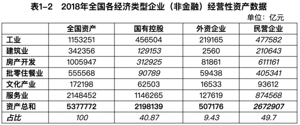 根据经济普查数据,到2018年底,全国非金融类企业的资产总额大约为537.78万亿元。其中,国有控股企业资产总额为219.8万亿元,占40.9%;民营企业资产总额为267.3万亿元,占49.7%。