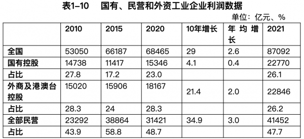 2010年-2020年,全国规模以上工业企业利润年均增长2.6%,其中国有工业年均增长0.45;2010年、2020年和2021年,规模以上工业企业利润中,国有企业占27.8%、23%和26.1%。