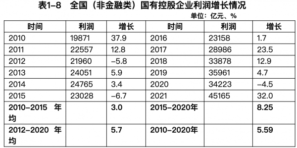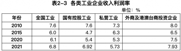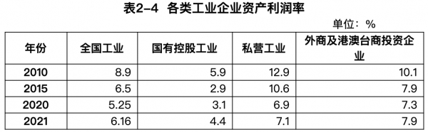 国有工业数据:2010年和2020年,全国规模以上工业企业的收入利润率分别为7.6%和6.1%,十年下降一个百分点;其中,国有控股工业企业为7.6%和5.4%,十年下降2个百分点。2021年,国有企业为6.9%,明显提高。