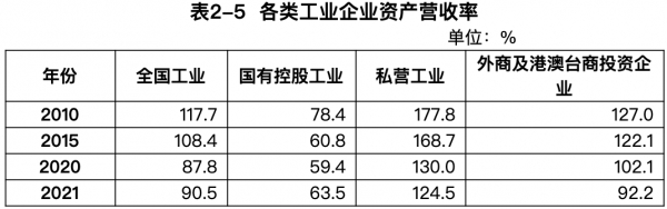 工业情况:2010年、2015年和2020年,全国规模以上工业企业的资产营收率(单位资产创造的营收)均在不断走低,分别为117.7%、108.4%和87.8%,2021年90.5%。其中,国有企业为78.4%、60.8%和59.4 %,2021年为65.5%,大约为全国工业平均资产营收率水平的2/3。总体看,国有工业企业的资产营收率明显高于全国国有控股企业水平。