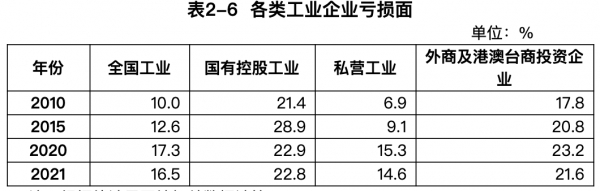 2010年、2015年和2020年,规模以上三类工业企业的亏损面(亏损企业占比)都在扩大;其中,国有企业为21.4%、28.9%、26.5%;十年算术平均为24%。2021年国有企业亏损面22.8%,有所下降。