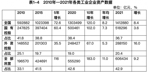 2010年,全国规模以上工业企业资产总额为59.29万亿元,国有工业企业资产占比为41.8%;2015年,全国规上工业企业资产总额为102.34万亿元,国有企业占比为38.8%;2020年,全国规上工业企业资产总额为130.35万亿元,国有企业资产占比为38.4%;2021年,国有工业企业资产51.83万亿元,占比为36.7%。