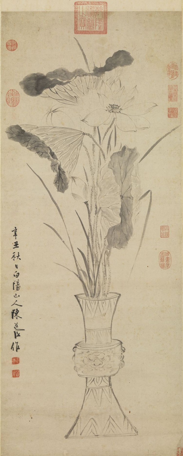 本幅设色,款:“云溪老渔陈洪绶仿王若水画于永柏书堂”。钤“陈洪绶印”。明 陈淳 瓶荷写生 轴