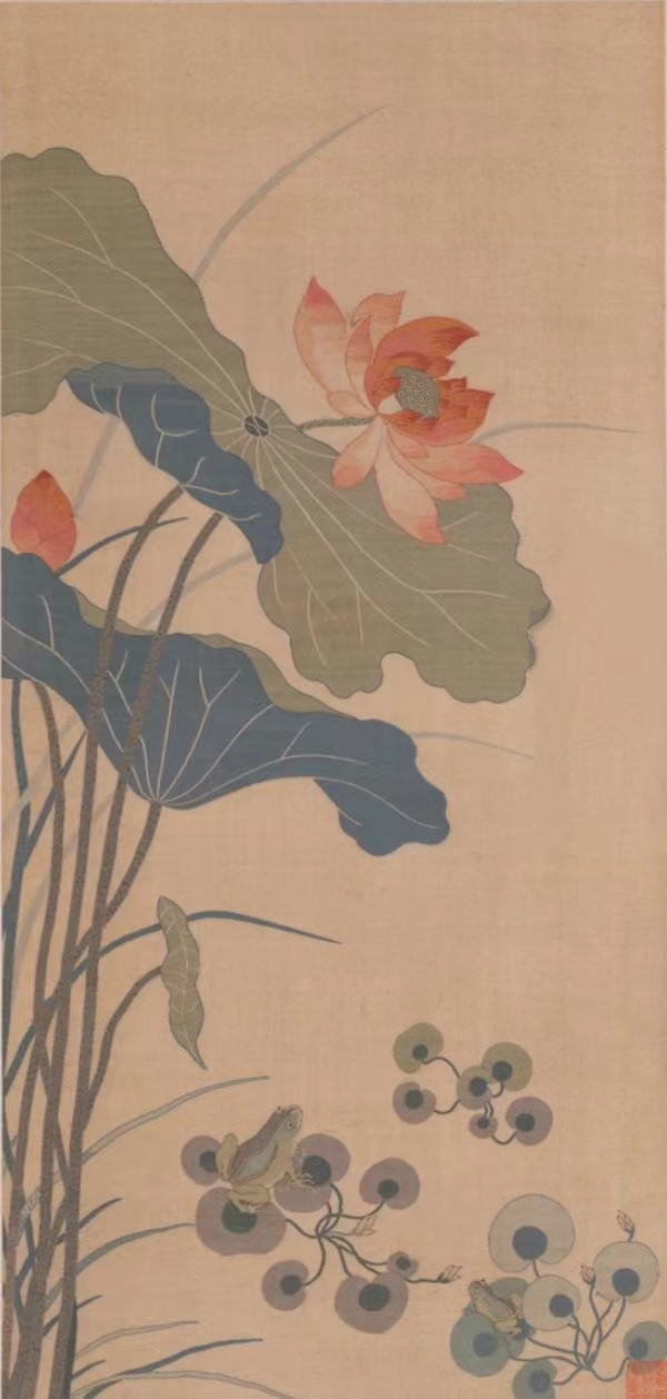 此图是在本色地上缂织荷花青蛙。画面上两片大荷叶将荷花衬托得分外娇柔,水面的浮萍上跳跃着两只青蛙。画面构图简练而富于情趣,颇具文人画的韵味。