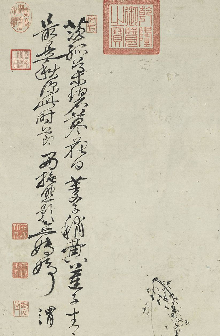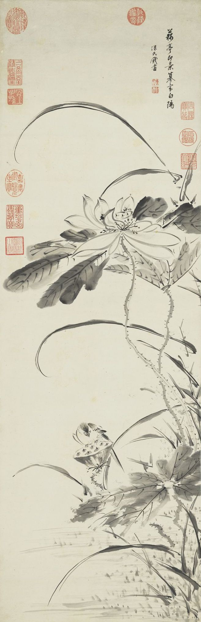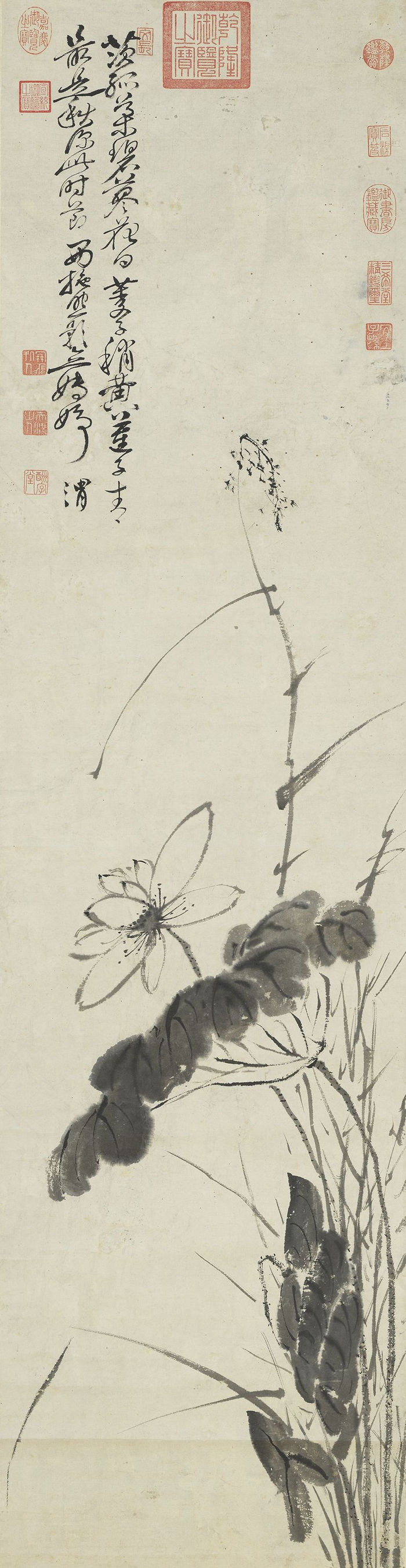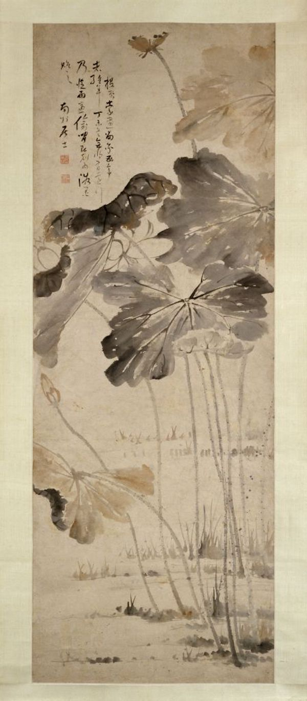 图中写暮秋池塘,以“泼墨法”放笔作荷叶数茎,墨色浓郁,水气淋漓。以细笔中锋勾写荷花、莲蓬,形简意赅,婆娑生姿,颇具枯秀韵致。下方画溪流潺湲,细苇汀草,一派恬静景象。幅上题句取自周敦颐《爱莲说》,借此突出了作者以荷花自况,高蹈磊落的风范。此图未署年款,据其题字结体行笔风貌,当为晚年率意写生之笔。傅山以善书者名世,所作山水、花草等皆则不规步于前人,多以行书、草书笔法直抒胸臆,自具面目,其画虽在明清画坛影响不大,但体现了晚明文人书家偶作翰墨游戏,实践“书画同源”理念的典型特色。