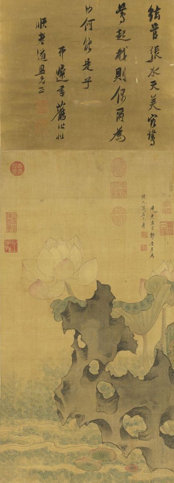 清高宗行书御题:不是人间种,疑生功德泉。藕长还叶直,实结复花鲜。四大或如是,一空属偶然。性当何处觅,聊示净因缘。戊子莲生日御题,即用其韵。
