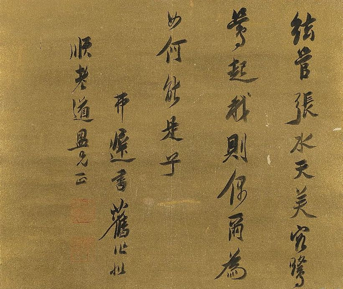 陈洪绶行书自题:弦管张水天,芙蓉鹭鸶起。我则偶尔为,如何能是兮。弗迟书旧作,似顺老道盟兄正。