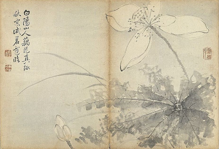 莲瓣的描绘技法类似后世的“没骨”法,不见勾勒之迹,渲染出花瓣既轻盈又腴润的质感。画家的写实功力极为扎实,每片莲瓣的形状、角度、色泽和光感都安排得无懈可击。至于瓣上红丝、蕊端腻粉,也一一仔细料理,微妙之处,使人叹为神工!旧题吴炳绘,无据。存《名笔集胜》册中。《虚斋名画录》著录。
