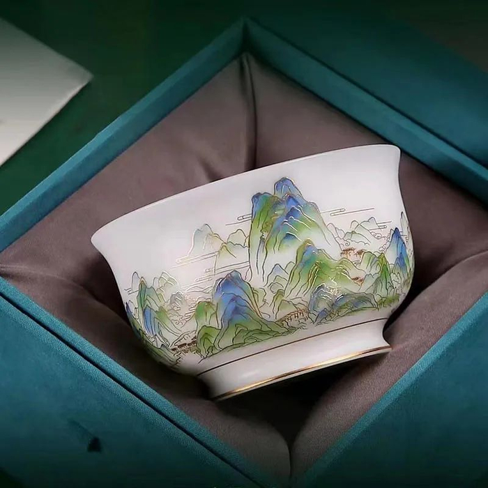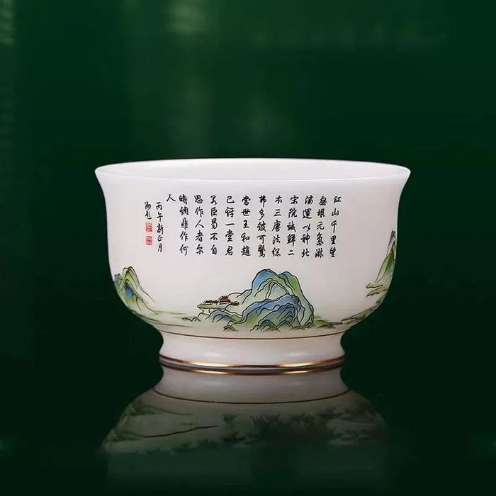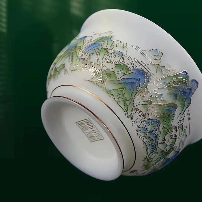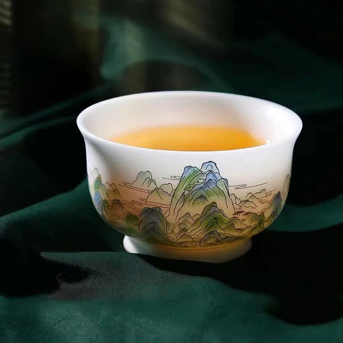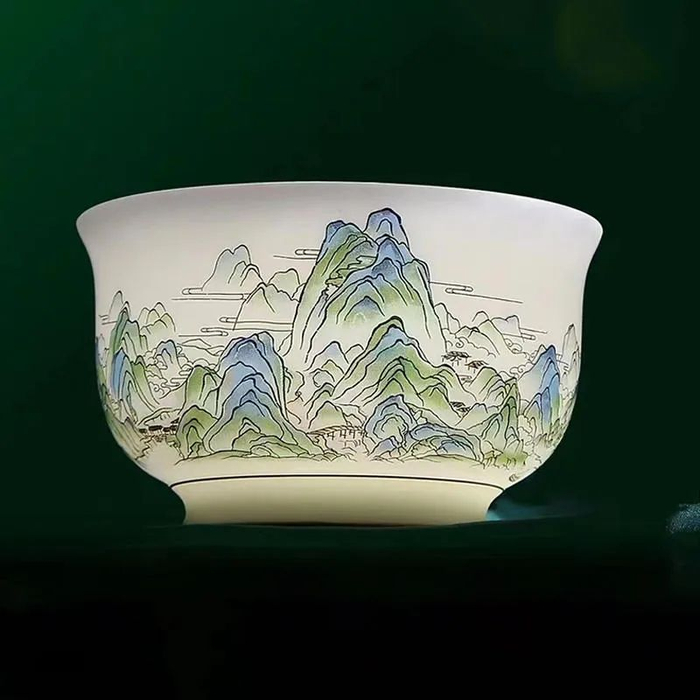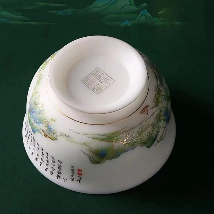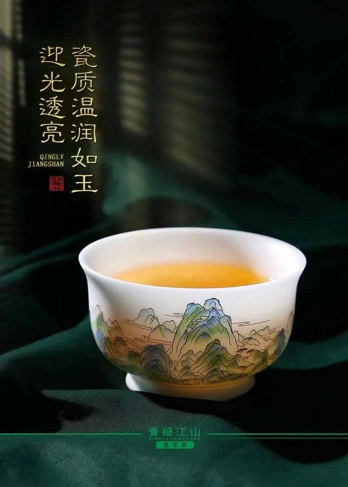 原料与工艺的考究,造就了青绿江山杯的温润如玉、纯白洁净。