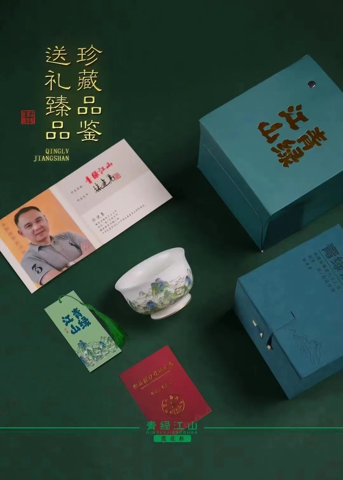 历经1330℃以上高温煅烧的瓷器自然纯白洁净,搭配大美青绿和贵气金线,尽情展现祖国大好河山的秀美。