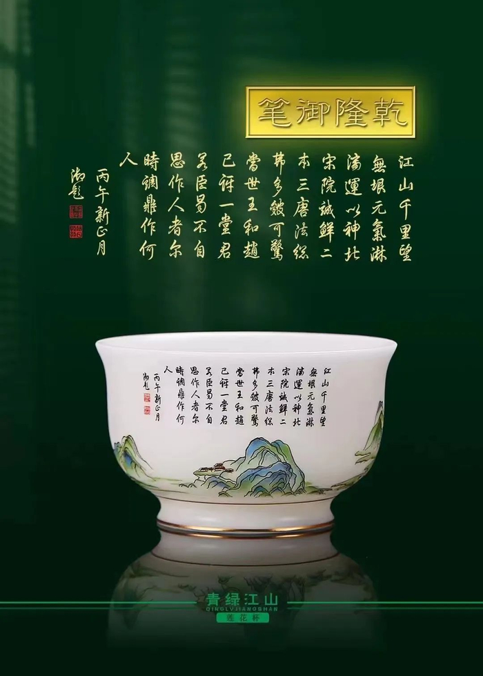 有了名画、有了好瓷,两相结合便有了这款青绿江山羊脂玉莲花杯。