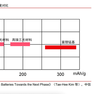 富锂锰基在2V-4.8V电压平台基础上的比容量可超200mA·h/g,是目前所用正极材料实际容量的两倍左右,被认为是继磷酸铁锂和三元材料之后最具前景的动力电池用正极材料。