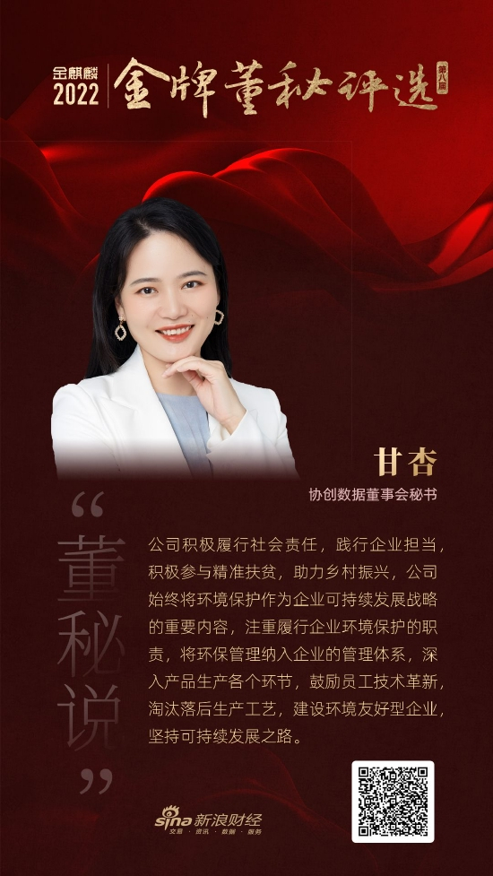 新浪财经主办的2022(第八届)金牌董秘网络票选于5月24日正式启动。本次金牌董秘网络票选时间为5月24日-6月21日。评选期间,新浪财经推出“董秘说”专访活动,通过董秘视角来带领投资者深入了解公司情况。本期,董秘甘杏带你走进协创数据。(给她投票)