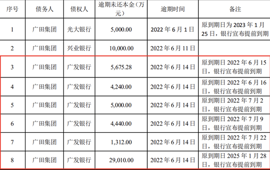 值得注意的是,涉及广发银行的逾期本金均宣布提前到期,其中原定到期日最长到2025年,如今提前了两年要多收回。