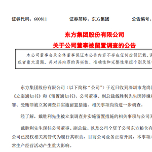 6月20日晚间,东方集团股份有限公司(以下简称“东方集团”)发布公告称,近日收到深圳市龙岗区监察委员会《立案通知书》和《留置通知书》,公司副总裁戴胜利先生因涉嫌私分国有资产罪、受贿罪被立案调查并实施留置措施。相关事项尚待进一步调查。