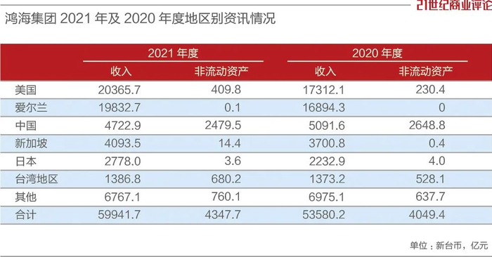 根据鸿海官方披露,2021年,其在中国大陆固定资产为2479.52亿新台币,约合560.37亿人民币,占到鸿海所有固定家业的57%,而东南亚、南亚未能单独成列。