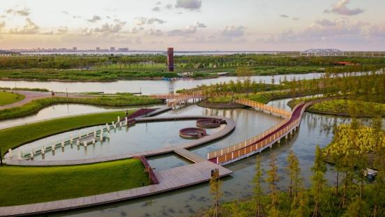 春花秋色城市公园以林风水泠为设计理念,分为“芷岸汀兰”滨水活力区、“鸥鹭齐飞”生态修复区、“花海拾遗”花坡野趣区、“百果争奇”自然休闲区、“活力水岸”居民活动区、“海陆临港”文化体验区,总占地113.5公顷。