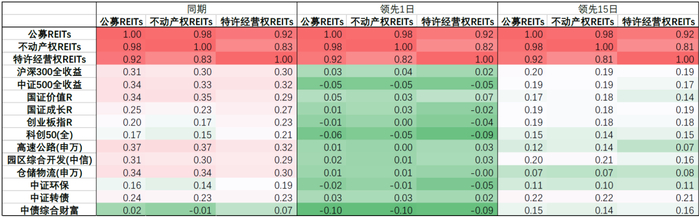 债市与股市相关板块、风格并不领先与公募REITs。在测算同期相关性系数之外,我们还将公募REITs市值加权总回报的每日对数收益率时间序列与前1、5、10、15、20个交易日的其它指数的对数收益率时间序列分别计算了相关性系数矩阵,探索是否有领先与公募REITs的板块。前1、5、10、20个交易日的测算下公募REITs与其他指数均无相关性,前15个交易的测算下公募REITs与沪深300、园区综合开发、中证转债指数的相关性系数虽然达到0.2,但统计学意义上仍在无相关性的定义区间,有意思的是,此维度下债市与公募REITs的相关性系数由同期的0.02上升至0.15。