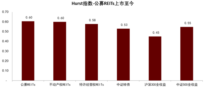 趋势性:公募REITs向上和向下突破均线的次数大多低于沪深300、中证500和转债指数,说明公募REITs更倾向于在均线的一侧延续走势,而不是在均线上下频繁震荡。Hurst指数也显示,公募REITs市场略倾向于保持原有运动方向,具有长期持续性。