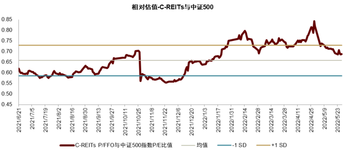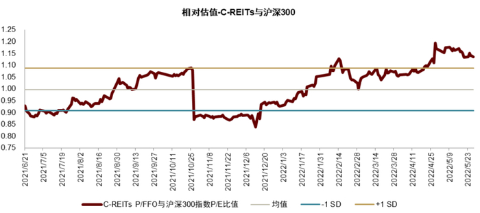 P/FFO(市值/可供分配金额)与P/E(市盈率)分别为REITs与股票的常用相对估值指标,二者的比值可以作为衡量两个市场的相对估值高低的指标。从公募REITs整体市场与沪深300、中证500对比,以及高速公路REITs、产业园REITs、仓储物流REITs、生态环保REITs分别与相关股票板块的指数对比,均可观察到相对估值指标近一年超出正负一个标准差的时间较少,但近期处于较高分位数,且各板块略有分化。目前,高速公路REITs相对高速公路板块股票的估值分位数比其他类型REITs相对估值指标的分位数更低,或因投资者担忧疫情反复对高速公路资产运营收入的影响,从相对估值指标来看,待市场进一步消化疫情因素之后高速公路REITs的配置价值有望再次凸显。
