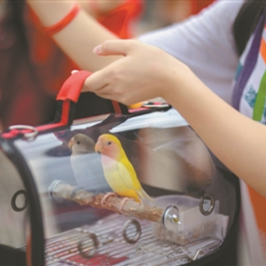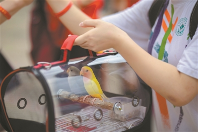 在真光中学考点,广东实验中学荔湾学校考生蔡同学的妈妈前来送考,手里还提着一个透明箱子,箱子里有两只蹦蹦跳跳、叽叽喳喳的小鸟。蔡同学的妈妈告诉记者,两只小鸟一直陪着孩子复习,“一起努力,一起奋斗”。她希望小鸟们能为孩子带来好心情。