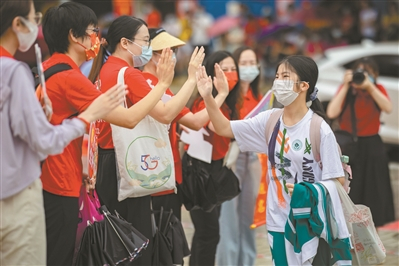 “红色”向来是送考大队的“主打色”。在广州市铁一中学考点,广州市八一实验学校的老师都穿着“金榜题名”红色短袖,还纷纷换上印有“中考必胜”的口罩。送考队伍中,还有来自培正中学、七中的高一学生,他们都毕业于广州市八一实验学校。趁着学校放假,他们特意回来为母校的学弟学妹送考。