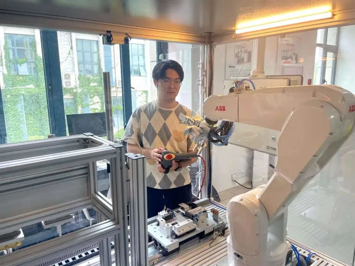 ▲谈佳豪在学校实训教室操作机器人。受访者供图