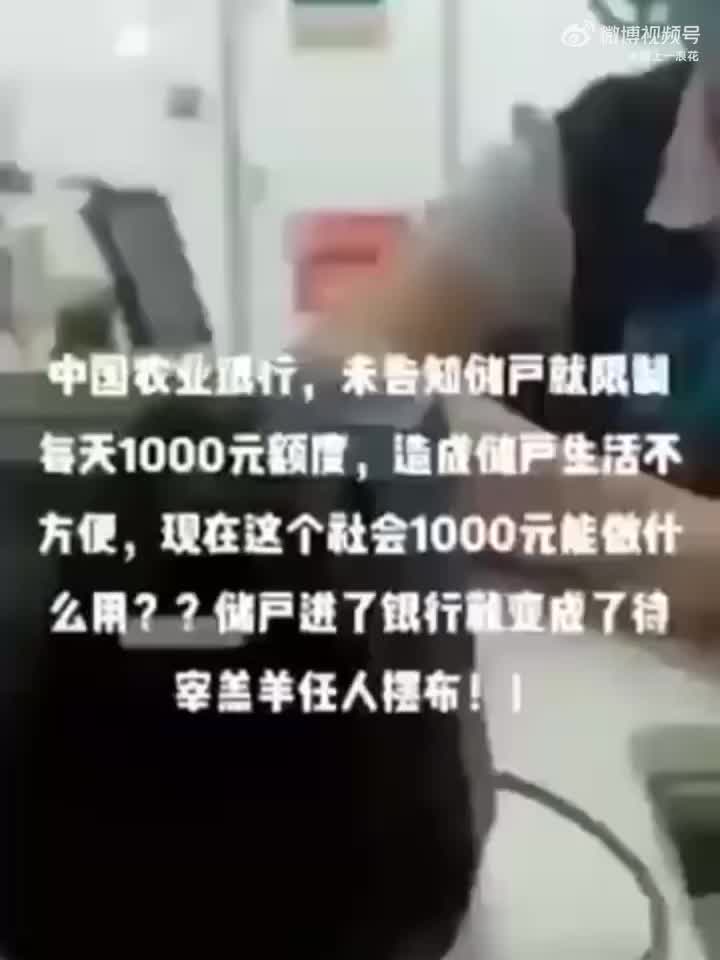 6月20日,一段储户称到中国农业银行取款并发现被限制额度的视频在微博流传。视频中,储户称自己的银行卡被限制,每天只有1000元取款额度,而银行柜员则称是系统自动设置。