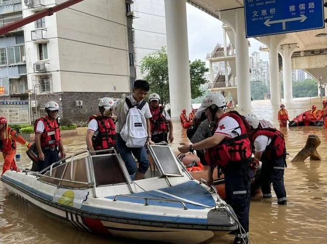 柳州市水上救援队用冲锋舟将被困居民送上岸。