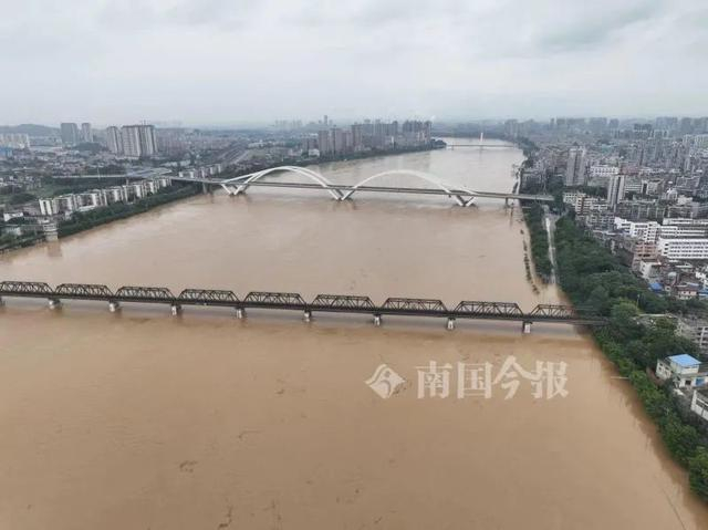 洪峰下的铁桥和广雅大桥