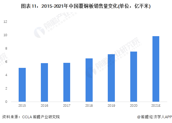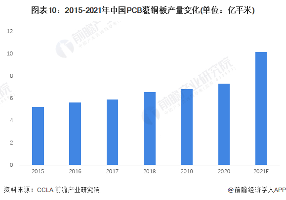 根据CCLA披露数据,2015-2020年我国PCB覆铜板销售量呈现连续上涨趋势。2020年我国各类覆铜板总销售量达7.53亿平米,同比增长5.50%。2021年我国各类电子消费产品需求量的激增,预计我国PCB覆铜板的销售量约为9.5亿平米。