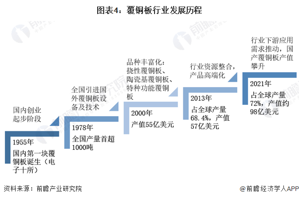 中国大陆刚性CCL产量和产值稳居世界第一。中国大陆覆铜板起步较晚,1955年在实验室中生产出第一块覆铜板,1978年产量首次突破1000吨,80年代中后期开始大规模引进国外设备、技术得到迅速发展。进入21世纪后中国覆铜板产值突破55亿元,覆铜板品种逐渐全面;2013年至今,中国覆铜板行业已经达到资源整合、行业高端化的阶段,产品产量已位列世界第一。