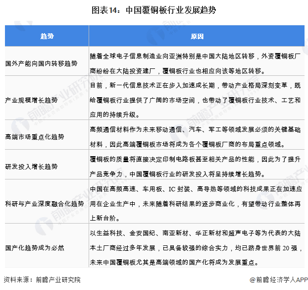 综合覆铜板当前的发展现状以及政府政策规划,未来中国覆铜板行业发展趋势会体现在国外产能向国内转移、产业规模增长、高端市场重点化、研发投入增长、科研与产业深度融合化等趋势发展。