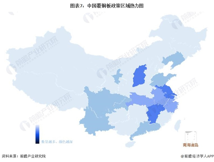 从前瞻统计得到的各省市政府部门出台的与覆铜板发展相关的政策数量来看,山西省、江苏省、江西省政府部门出台覆铜板相关政策热度较高;其次有湖北、安徽、浙江三省,广东、云南、四川等省份均有相应的覆铜板政策支持。
