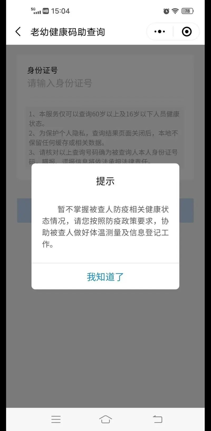 记者又通过该小程序“老幼健康码助查询”,查询了部分60岁以上、居住地和接种地均不在当地的几位朋友的接种情况,查询结果或是显示“暂不掌握被查人防疫相关健康状态情况”,或是显示“无接种记录”。